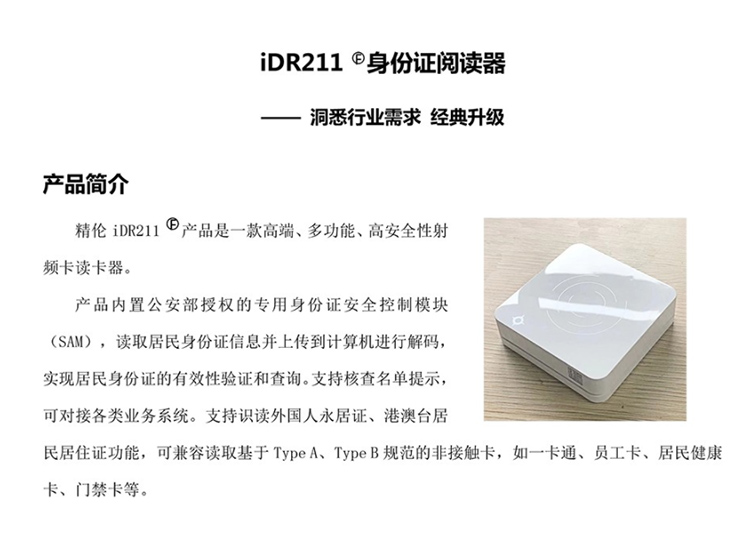 精倫IDR211身份證閱讀器是中國十大公安部認證的身份證讀卡器品牌,產品具有良好的穩定性。