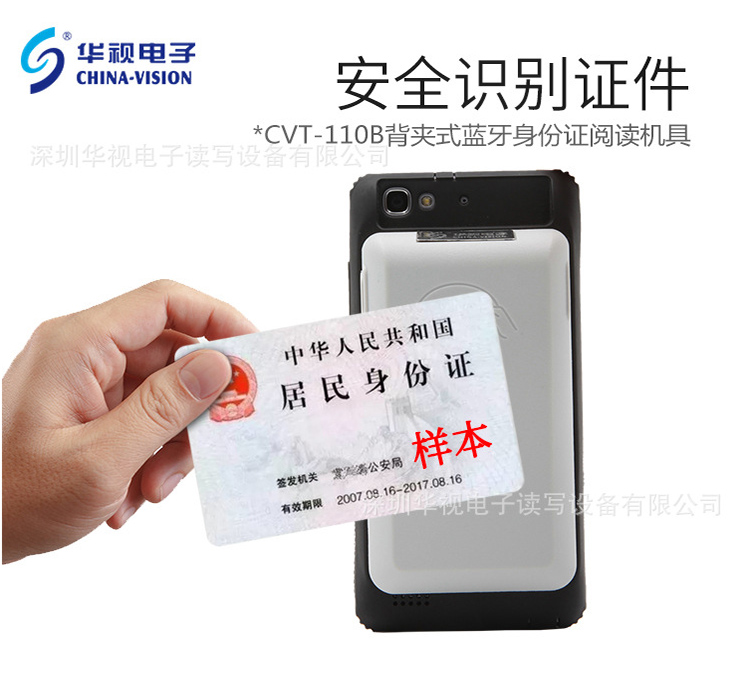 華視CVT-110B背夾式藍(lán)牙身份證閱讀機(jī)具可以讀取身份證信息,藍(lán)牙鏈接手機(jī)讀取,可以方便的固定在手